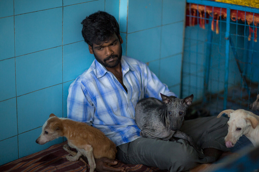 - Another older Heart story...This one is really beautiful. It's about an "old guy"(hmm!!! The connection between the two of us just occurred to me: two old guys!) It was during the day. A nice day. Sun. Pleasant temp. I passed him on my two-wheeler. He was lying on his side under one of those wooden lane dividers. No hair. Cadaverously thin. Unmoving. He seemed dead. I pulled over, bent down, put my cheek against his, and stroked him to see if there was any life. Yes! I called Vishwa. He and Pandi came out and took him to the Shelter.