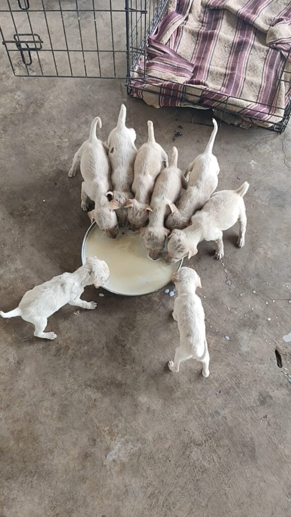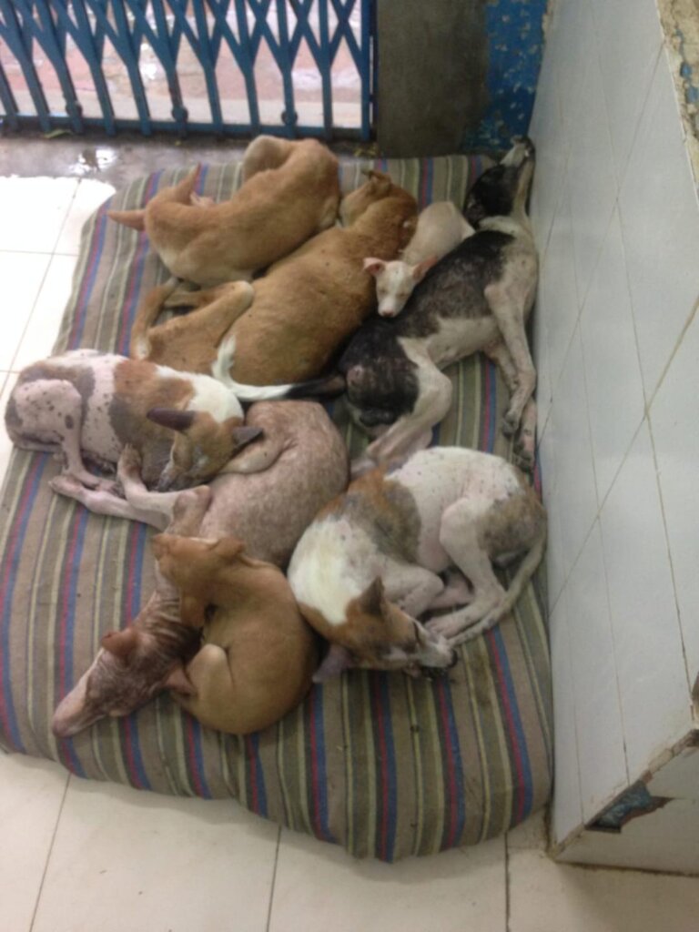 - Got a 1pm call at the Shelter from a shop owner about 20kms away. There was a dog with a bad skin condition, no hair, and sores on her body, and a very bad maggot wound on her nose. Pandi and Prem went out. It was a 2 year old female. She was fast, and It took an hour to catch her. The maggot wound was old, had a lot of maggots, and smelled awful. She was very uncomfortable. Dr. Mahesh treated the maggot wound first. Then this girl got a medicated bath. She started in Cage 2. Mani and Santosh cared for her. She was bathed every 5 days with ointment and tablets. We've now had her two weeks. Her skin is healed but the hair's not fully in yet. She's a real sweetie and playing with all the other dogs. The shop owner who called has visited twice. He's going to adopt her in another two weeks.