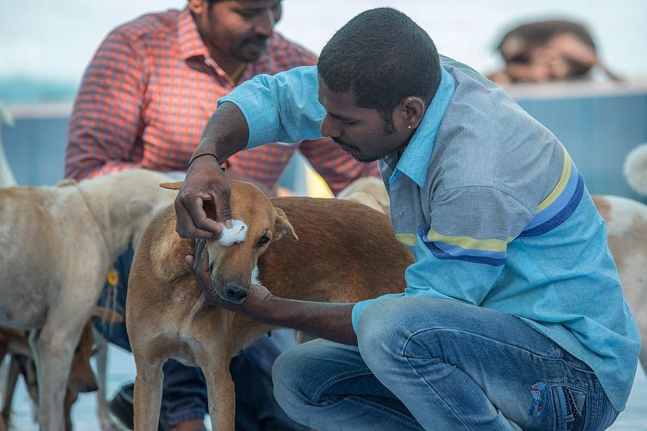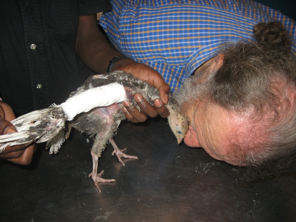 - We received a call from a village 65 kms away. A dog with a horrible infected wound on its back leg was going to houses for food and being chased away because he smelled so bad. People in one house tried to kill him…Vishwa got there about 10am. Just outside of town there was a large, wooded area, making it difficult to find the dog. Ten village people helped Vishwa look for him all day and couldn’t find him…Finally, Vishwa left around 6pm, when it was starting to get dark. The next day he returned at 9:30am with Prem Kumar and Arunagiri. They looked until 5p and gave up…The third day, Vishwa took our beloved Pandi with him, leaving Tiru at 4:30a. They got there at 6am. At 8 o’clock, they found out that the dog in question usually turned up at a particular house between 8 and 10. They waited, finally spotted him, chased him down and caught him…He had hundreds of maggots in the wound. Scores fell off in the car….Dr.Raja said he was weak, depleted, anemic, and in pain. He gave the dog a painkiller and i.v. with neurobion for nutrition, and tended the wound. The poor babe was only five years old. We’ve had him for five weeks, now. His wound is almost fully healed. He’s regained his strength, and has several furry friends with whom he wrestles, rests, and sleeps. He’s doing beautifully, and in two weeks Vishwa will take him back to his territory.