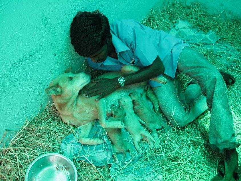 Finding homes for them, though, is a big problem and requires major, major effort. Vishwa has three students from the nearby college who go out up to 100kms looking for good homes…Then Vishwa goes to check the homes out. (About half are good.) The students can receive 500 rupees from us for each puppy placed…but they’re “deeply into it” and refuse to take any compensation other than reimbursement for their expenses. Our beloved Vishwa spends an incredible amount of time doing this. It’s not easy to find good homes. Sometimes a full day’s searching yields none. (At this point in time, since opening, Vishwa has remarkably placed over 1000 puppies in good homes.)