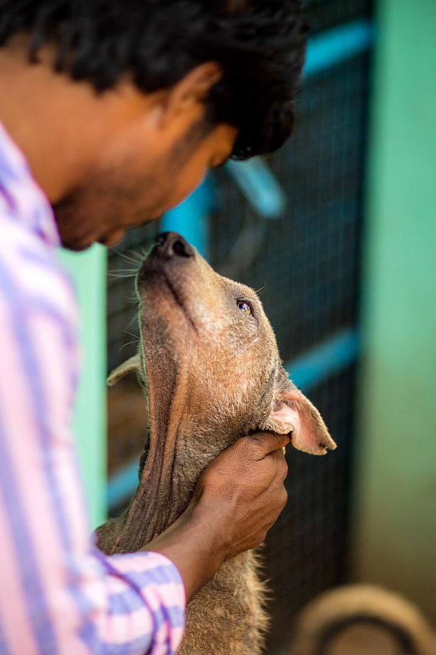 The other night I was riding on my Honda Activa, feeding the 10 to 20 dogs I see nightly. It's a private thing, not Shelter. It simply feels good. Came across a young one who was really thin--her ribs prominently showing, and her stomach very narrow. It was about 9 or 9:30pm. Called Vishwa at home and he sent two of our guys from the night shift to get her. But she was too shy of people, and I didn't want her chased down. So Vishwa came out and after a lot of gentle coaxing he was able to get her.